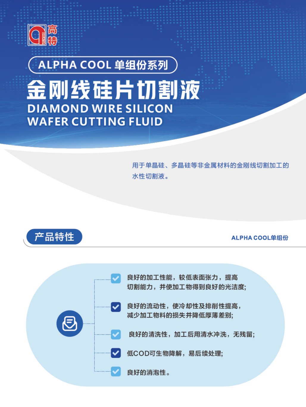 產(chǎn)品用途:GREATOP ALPHA COOL BS-1用于藍(lán)寶石等非金屬材料之線切割及研磨等加工的水性加工液;